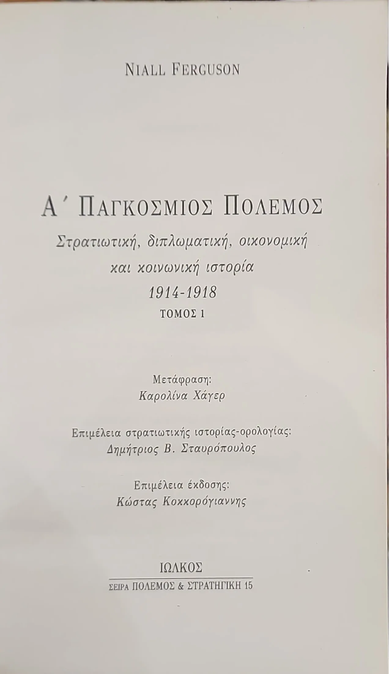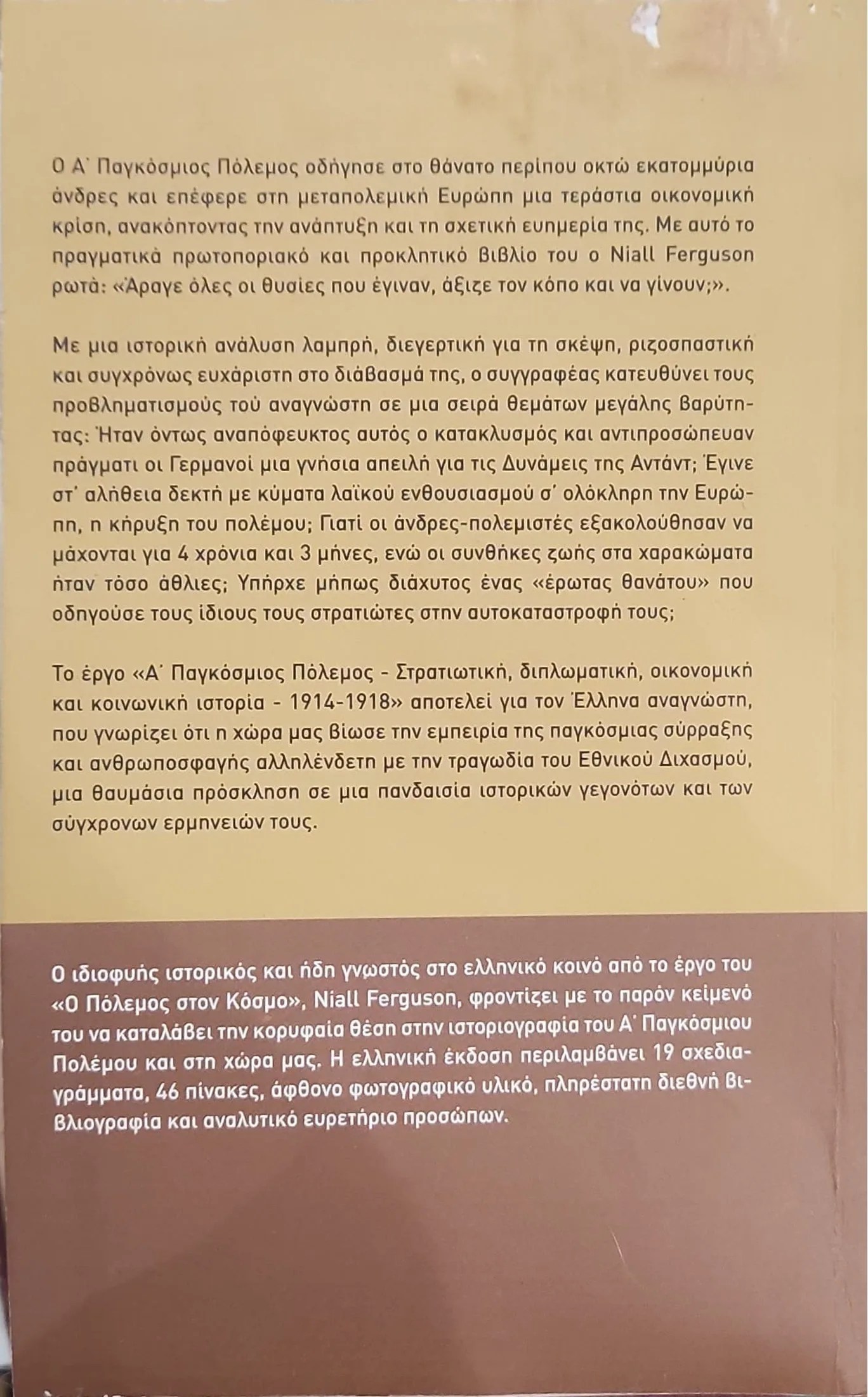 Ο Α΄ Παγκόσμιος Πόλεμος οδήγησε στο θάνατο περίπου οκτώ εκατομμύρια άνδρες και επέφερε στη μεταπολεμική Ευρώπη μια τεράστια οικονομική κρίση, ανακόπτοντας την ανάπτυξη και τη σχετική ευημερία της. Με αυτό το πραγματικό πρωτοποριακό και προκλητικό βιβλίο του ο Niall Ferguson ρωτά: «Άραγε όλες οι θυσίες που έγιναν, άξιζε τον κόπο και να γίνουν;» Με μια ιστορική ανάλυση λαμπρή, διεγερτική για τη σκέψη, ριζοσπαστική και συγχρόνως ευχάριστη στο διάβασμά της, ο συγγραφέας κατευθύνει τους προβληματισμούς του αναγνώστη σε μια σειρά θεμάτων μεγάλης βαρύτητας: Ήταν όντως αναπόφευκτος αυτός ο κατακλυσμός και αντιπροσώπευαν πράγματι οι Γερμανοί μια γνήσια απειλή για τις Δυνάμεις της Αντάντ; Έγινε στ’ αλήθεια δεκτή με κύματα λαϊκού ενθουσιασμού σ’ ολόκληρη την Ευρώπη, η κήρυξη του πολέμου; Γιατί οι άνδρες-πολεμιστές εξακολούθησαν να μάχονται για 4 χρόνια και 3 μήνες, ενώ οι συνθήκες ζωής στα χαρακώματα ήταν τόσο άθλιες; Υπήρχε μήπως διάχυτος ένας «έρωτας θανάτου» που οδηγούσε τους ίδιους τους στρατιώτες στην αυτοκαταστροφή τους; (. . .) (ΑΠΟ ΤΗΝ ΠΑΡΟΥΣΙΑΣΗ ΣΤΟ ΟΠΙΣΘΟΦΥΛΛΟ ΤΟΥ ΒΙΒΛΙΟΥ)