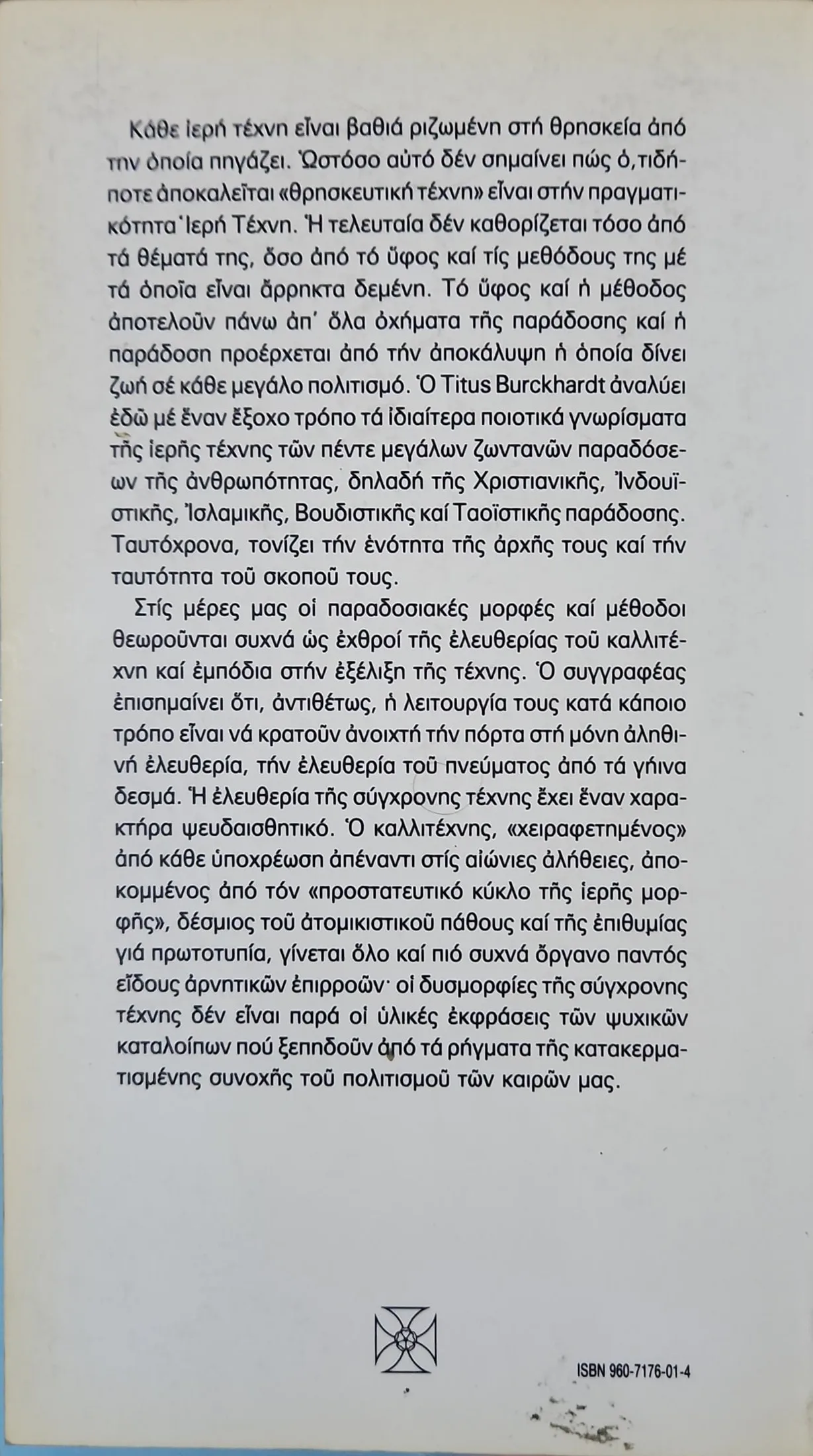 Σε αυτό το κλασικό σύγγραμμα, ο Titus Burckhardt ορίζει την ιερή τέχνη ως έναν προστατευτικό κύκλο ιεράς μορφής που κρατά ανοιχτή την πόρτα στην ελευθερία του πνεύματος. Αντιπαραβάλλει τον παραδοσιακό καλλιτέχνη, ο οποίος λειτουργεί ως φορέας αιώνιων αληθειών μέσα από την προσευχή και τη νηστεία, με τον σύγχρονο καλλιτέχνη που συχνά εγκλωβίζεται στον ατομικισμό και την αναζήτηση της πρωτοτυπίας. Μέσα από λεπτομερείς αναλύσεις, ο συγγραφέας αναδεικνύει τον συμβολισμό της χριστιανικής εικόνας, την ιερατική ακινησία του Βούδα και τη μεταφυσική διάσταση της ισλαμικής τέχνης, τονίζοντας ότι το ύφος και η μέθοδος είναι αυτά που μετατρέπουν την ύλη σε όχημα της παράδοσης.