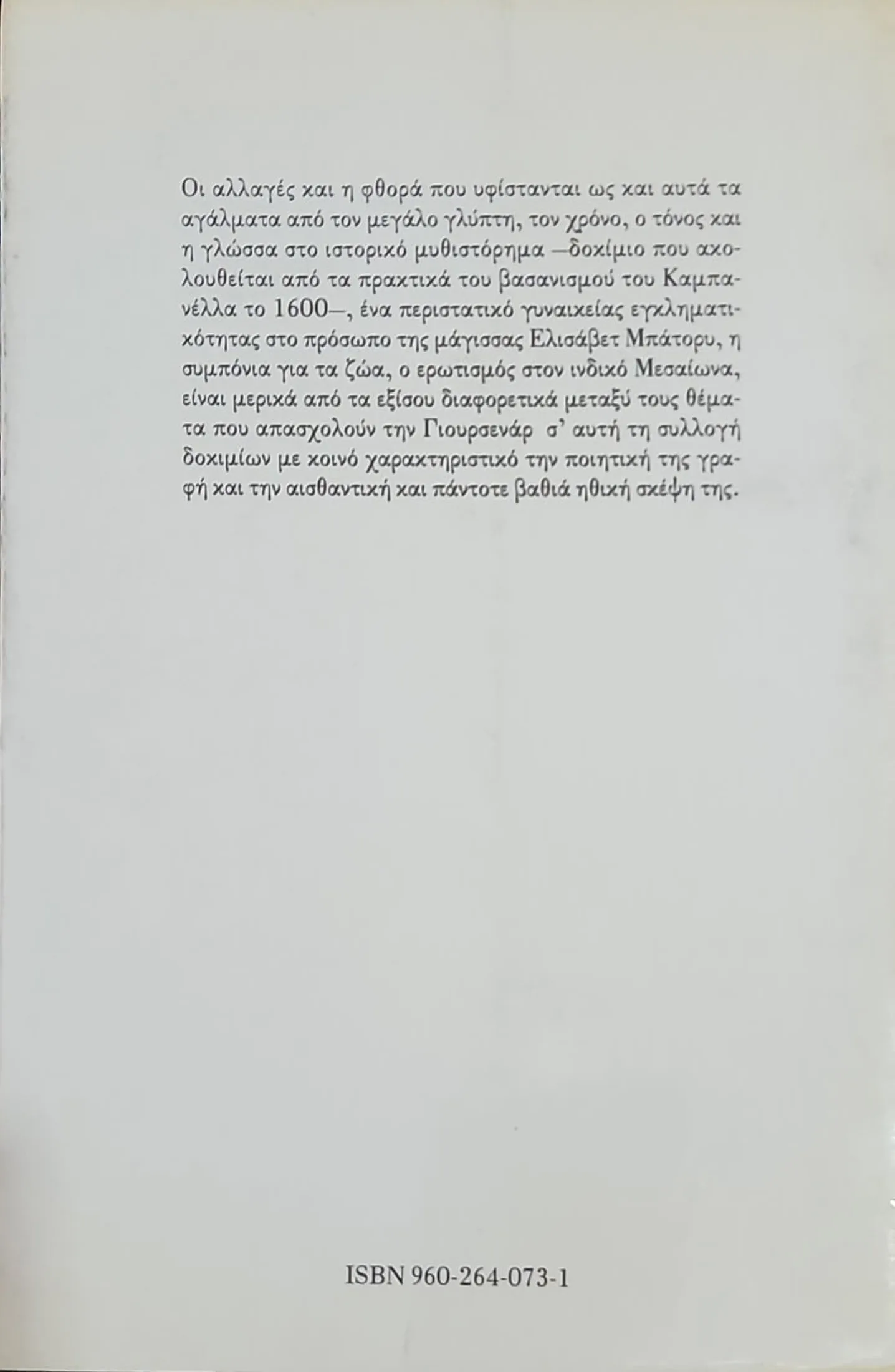 Η συλλογή ταξιδεύει τον αναγνώστη από τον αρχαίο ποιητή Οππιανό και τον ινδουιστικό ταντρισμό μέχρι τη μεσαιωνική Αγγλία και το φεουδαρχικό Ιαπωνικό θέατρο, ενώ περιλαμβάνει συγκλονιστικές αναφορές στις μεγάλες της λογοτεχνικές αγάπες, όπως τον Αδριανό και τον Ζήνωνα. Με την κρυστάλλινη και σοφή της γραφή, η Γιουρσενάρ υπερασπίζεται τον σεβασμό προς τη φύση και τα ζώα, στοχάζεται πάνω στα τελετουργικά του θανάτου (από το Χάλοουιν μέχρι το Πάσχα) και καταθέτει μια βαθιά ανθρωπιστική κοσμοθεωρία που γεφυρώνει την Ανατολή με τη Δύση κάτω από το πρίσμα της αιωνιότητας.