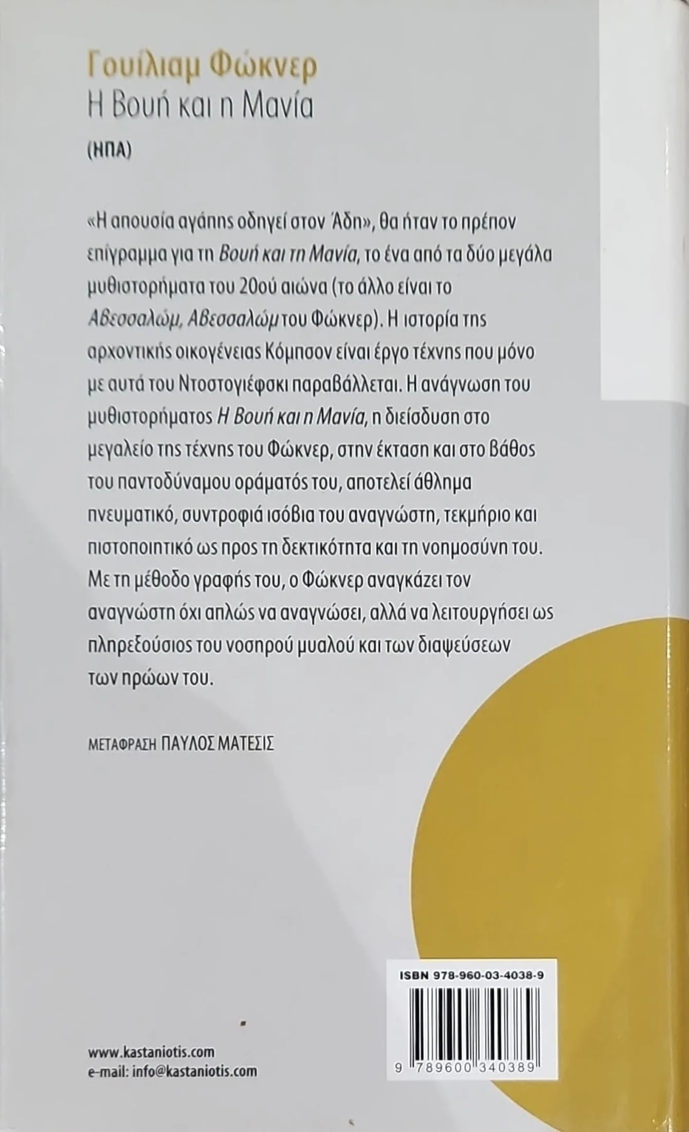 Το αριστούργημα του νομπελίστα Γουίλιαμ Φώκνερ, Η Βουή και η Μανία, είναι ένα βαθιά διεισδυτικό μυθιστόρημα για την τραγωδία της οικογένειας Κόμψον, μία από τις πλέον αξιομνημόνευτες στην παγκόσμια λογοτεχνία. Με θέμα την «απουσία αγάπης που οδηγεί στον Άδη», το έργο αναλύει τη φθορά, τη νεύρωση και τη βίαιη κληρονομιά μιας οικογένειας. Μέσα από μια σπασμένη και ψυχολογικά φορτισμένη αφήγηση, ο Φώκνερ παρουσιάζει χαρακτήρες όπως η επαναστατική Κάντυ, ο παιδικός Μπέντζυ και ο κυνικός Τζέισον, αναγκάζοντας τον αναγνώστη να διεισδύσει στο μεγαλείο της τέχνης του και να λειτουργήσει ενεργά για την κατανόηση του παντοδύναμου οράματός του. Το έργο θεωρείται ένα από τα σπουδαιότερα του 20ού αιώνα