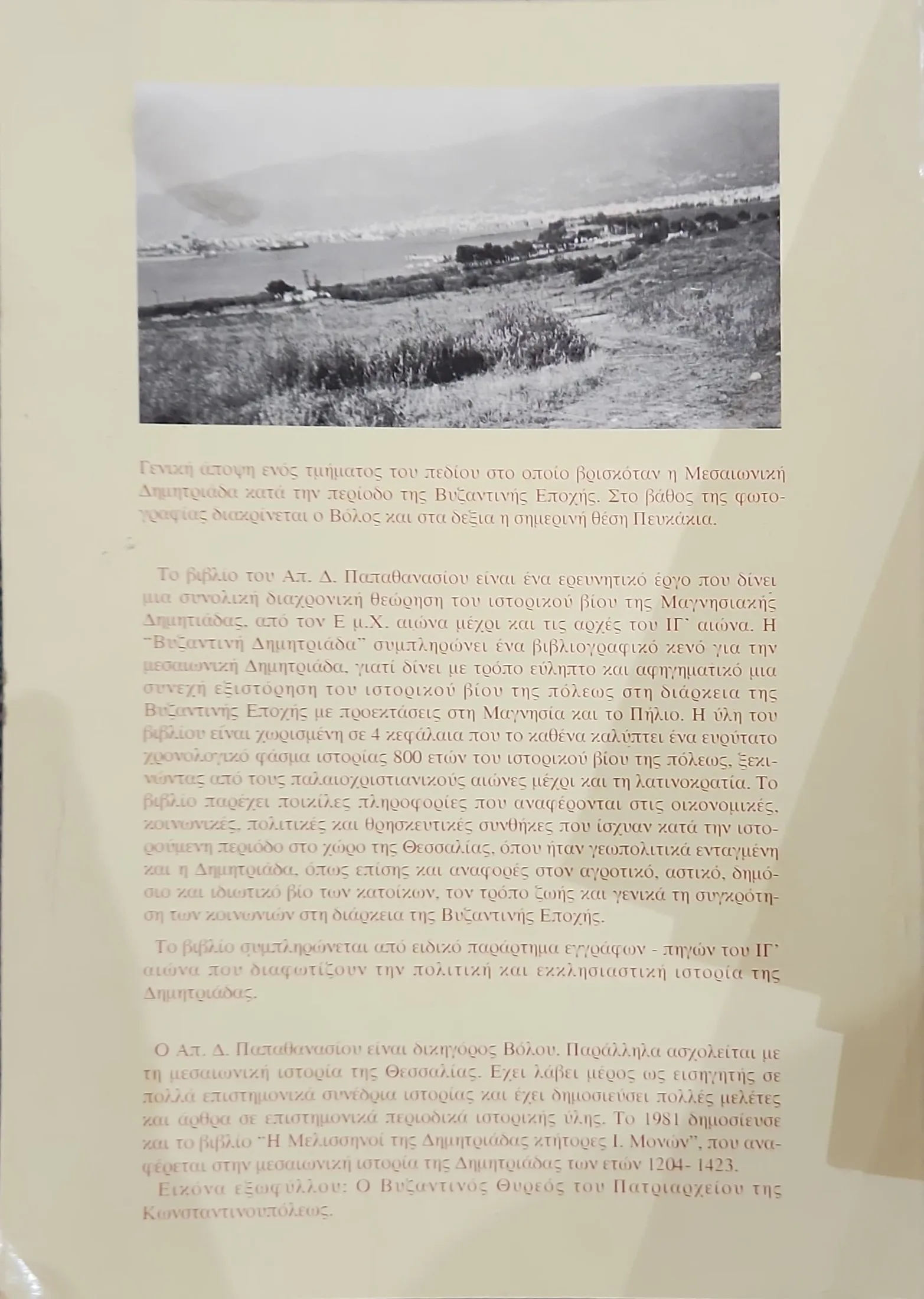 Ο Απόστολος Δ. Παπαθανασίου ανασυνθέτει την εικόνα της Δημητριάδας ως διοικητικού, εκκλησιαστικού και οικονομικού κέντρου της βυζαντινής Θεσσαλίας. Μέσα από τη μελέτη γραπτών πηγών, αρχαιολογικών ευρημάτων και επιγραφών.