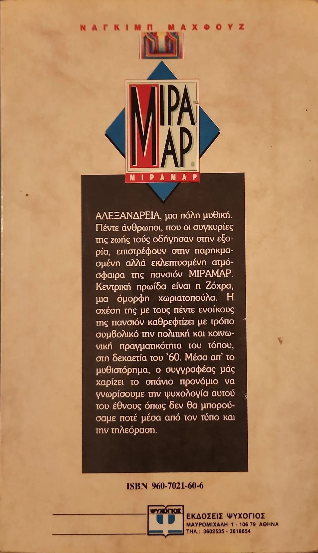 Το βιβλίο «Μιραμάρ» αποτελεί ένα από τα αριστουργήματα του νομπελίστα Ναγκίμπ Μαχφούζ. Μέσα από την τεχνική των πολλαπλών αφηγητών (τέσσερις διαφορετικές οπτικές γωνίες), ο συγγραφέας στήνει ένα σκηνικό στην κοσμοπολίτικη αλλά παρηκμασμένη Αλεξάνδρεια, χρησιμοποιώντας μια πανσιόν ως μικρογραφία ολόκληρης της Αιγύπτου.