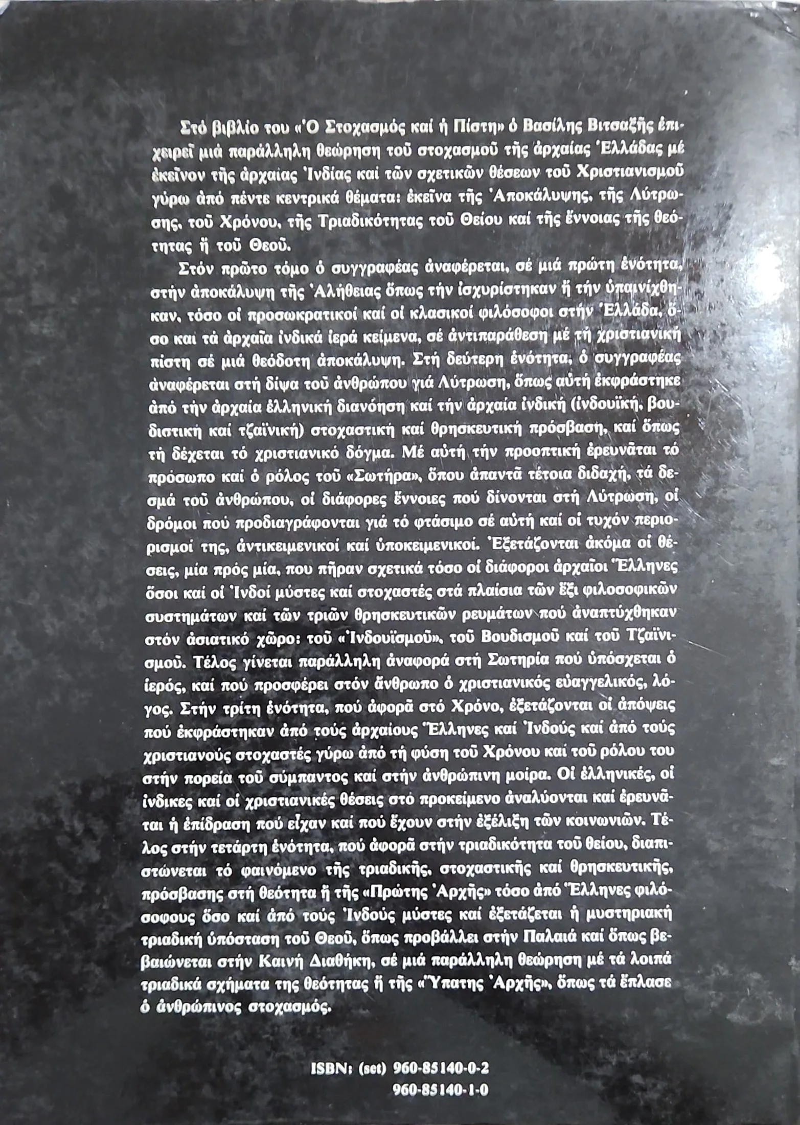 Το εκτενές αυτό θεολογικό και φιλοσοφικό έργο του Βασίλη Βιτσάξη με τίτλο «Ο Στοχασμός και η Πίστη» αποτελεί μια συγκριτική μελέτη που αντιπαραβάλλει τον αρχαίο ελληνικό στοχασμό με τον ινδικό στοχασμό (Ινδουισμός, Βουδισμός, Τζαϊνισμός) και τις θέσεις του Χριστιανισμού γύρω από τα κεντρικά υπαρξιακά και θρησκευτικά ερωτήματα. Ο συγγραφέας διερευνά σε βάθος θέματα όπως η Αποκάλυψη, η Λύτρωση, ο Χρόνος, η Τριαδικότητα του Θείου και η θέση του ανθρώπου στο Σύμπαν, εξετάζοντας πώς οι τρεις αυτές παραδόσεις απαντούν στα αιώνια ερωτήματα για τον σκοπό της ζωής και την ανθρώπινη μοίρα. Η μελέτη περιλαμβάνει λεπτομερή ανάλυση της έννοιας της Θεότητας ως «Ένα ή πολλά», καθώς και συγκριτική έρευνα για την πρόσβαση στην «Πρώτη Αρχή» μέσω των Ελλήνων φιλοσόφων και των Ινδών μυστικιστών, αποτελώντας ένα απαραίτητο ανάγνωσμα για τη συγκριτική Θεολογία και Φιλοσοφία.