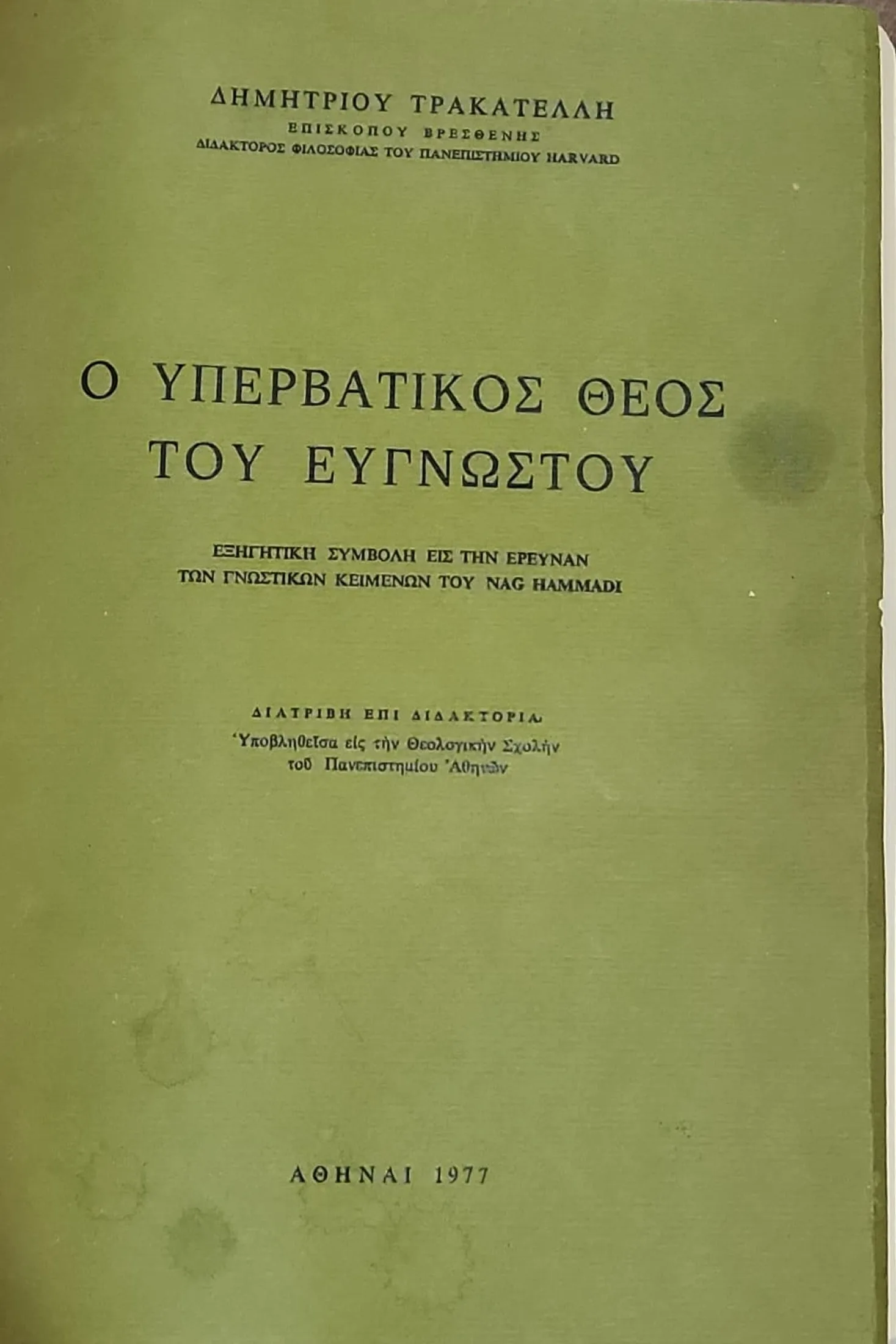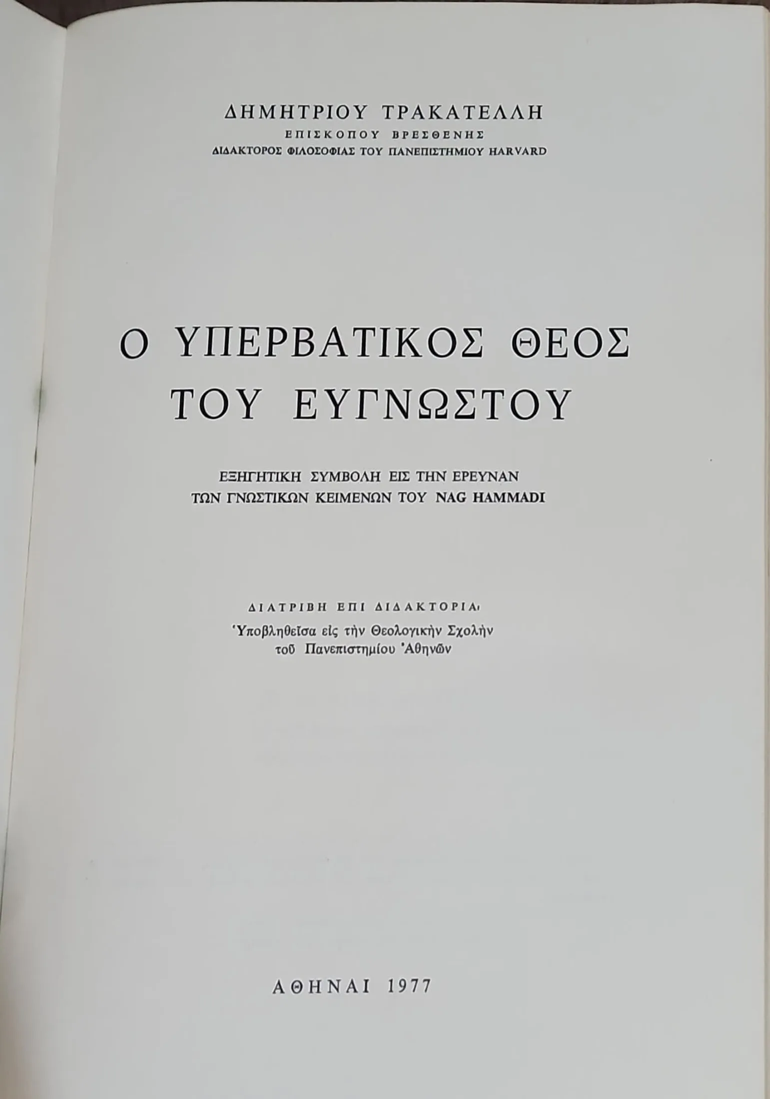 Διδακτορική διατριβή του Δημητρίου Τρακατέλλη, που εξετάζει τον ρόλο του Υπερβατικού Θεού στις γνωστικές πηγές που βρέθηκαν στην κοιλάδα του Nag Hammadi. Η εργασία αυτή αποτελεί μια ερμηνευτική προσέγγιση στα κείμενα αυτά, εστιάζοντας στην έννοια του Υπερβατικού Θεού, όπως αυτή αναδύεται μέσα από τα γνωστικά κείμενα.