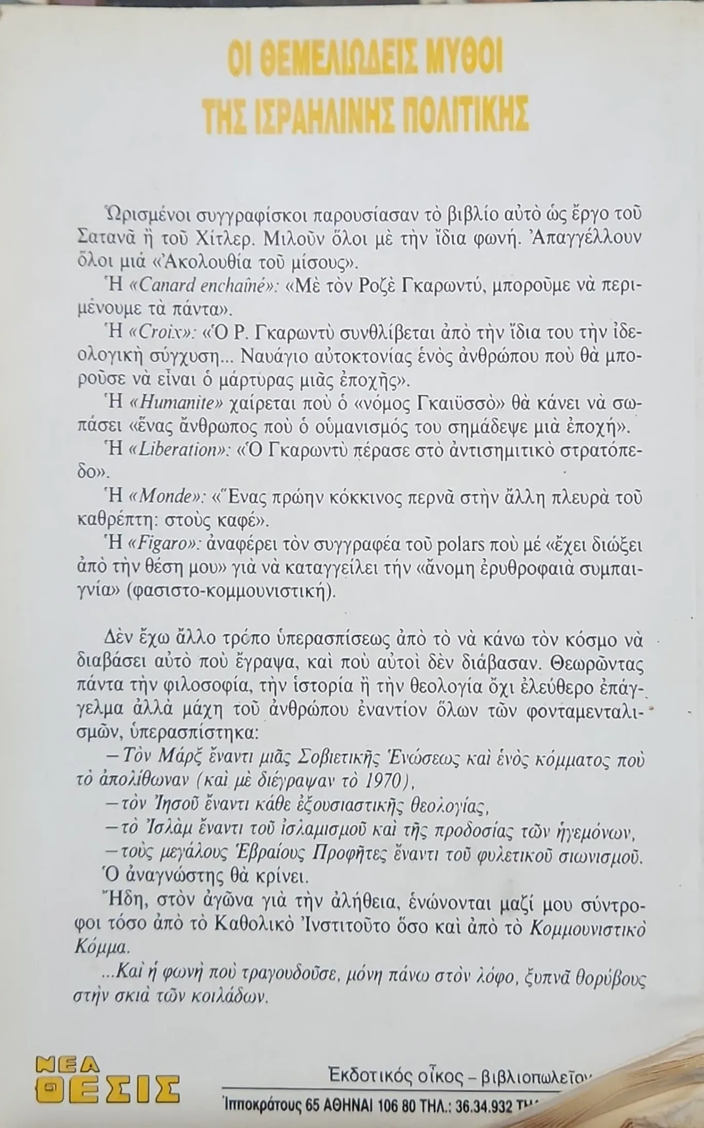 Το βιβλίο «Οι θεμελιώδεις μύθοι της ισραηλινής πολιτικής» του Roger Garaudy (Ροζέ Γκαρωντύ) αποτελεί ένα από τα πιο αμφιλεγόμενα και πολυσυζητημένα έργα των τελευταίων δεκαετιών διεθνώς. Ο συγγραφέας, εξέχων Γάλλος διανοούμενος με μακρά πορεία στον μαρξισμό πριν ασπαστεί το Ισλάμ, προκάλεσε θύελλα αντιδράσεων όταν επιχείρησε να αποδομήσει αυτό που ο ίδιος ονομάζει «ιστορικούς και θεολογικούς μύθους» που στηρίζουν την ύπαρξη και την πολιτική του κράτους του Ισραήλ.