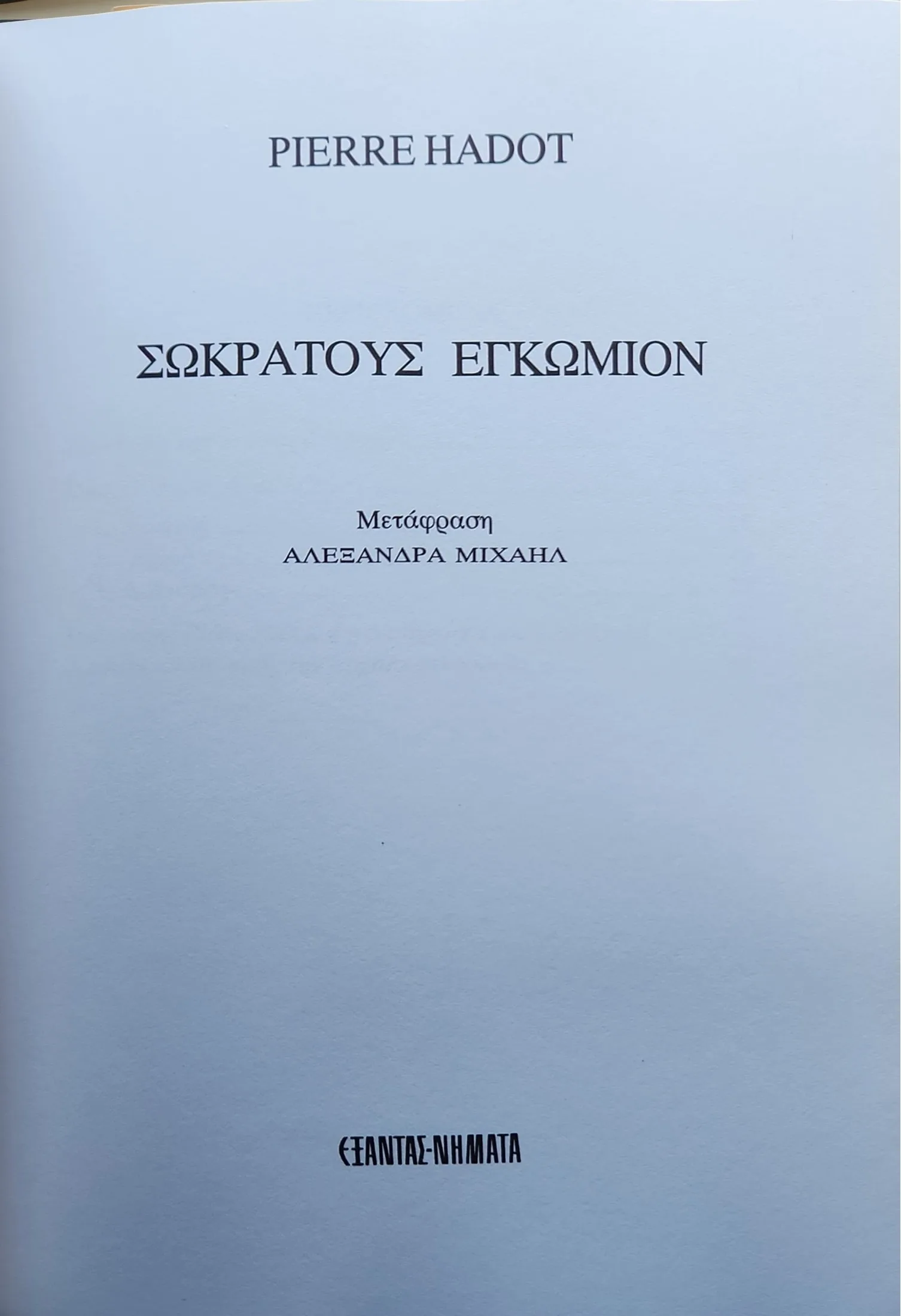Mία σύντομη, αλλά εξαιρετικά λόγια, μελέτη που βασίζεται σε διάλεξη που εκφωνήθηκε το 1974 από τον Πιέρ Χαντό (Γάλλος φιλόσοφος, ιστορικός και φιλόλογος, ειδικός στην αρχαιότητα, βαθύς γνώστης της Ελληνιστικής περιόδου και ιδιαίτερα του Νεοπλατωνισμού και του Πλωτίνου).