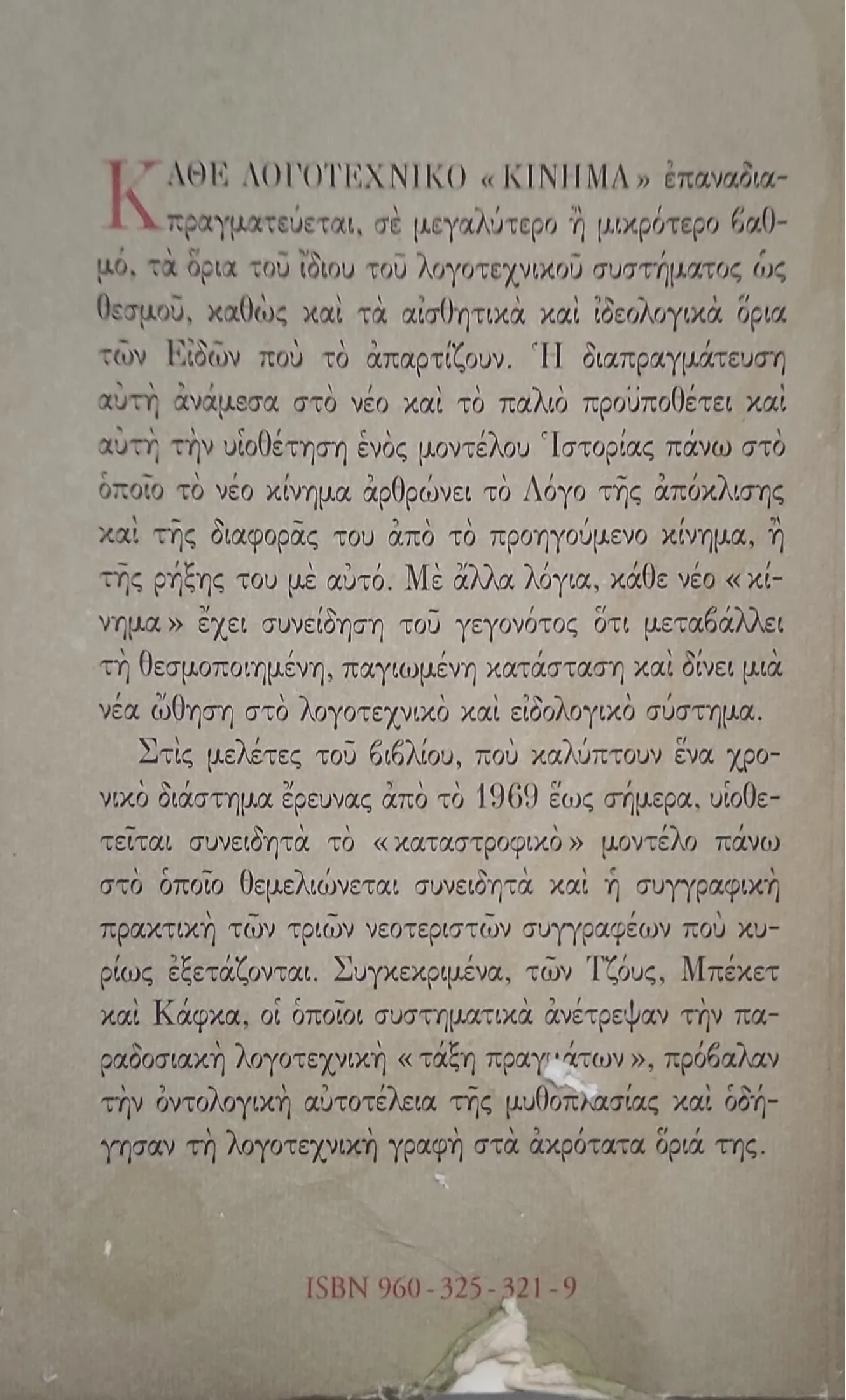 Στις μελέτες του βιβλίου, που καλύπτουν ένα χρονικό διάστημα έρευνας από το 1969 έως σήμερα, υιοθετείται συνειδητά το “καταστροφικό” μοντέλο πάνω στο οποίο θεμελιώνεται συνειδητά και η συγγραφική πρακτική των τριών νεοτεριστών συγγραφέων που κυρίως εξετάζονται εδώ. Συγκεκριμένα των Τζόυς, Μπέκετ και Κάφκα, οι οποίοι συστηματικά ανέτρεψαν την παραδοσιακή λογοτεχνική “τάξη πραγμάτων”, πρόβαλαν την οντολογική αυτοτέλεια της μυθοπλασίας και οδήγησαν τη λογοτεχνική γραφή στα ακρότατα όριά της.” (Από τον πρόλογο της Τζίνας Πολίτη)