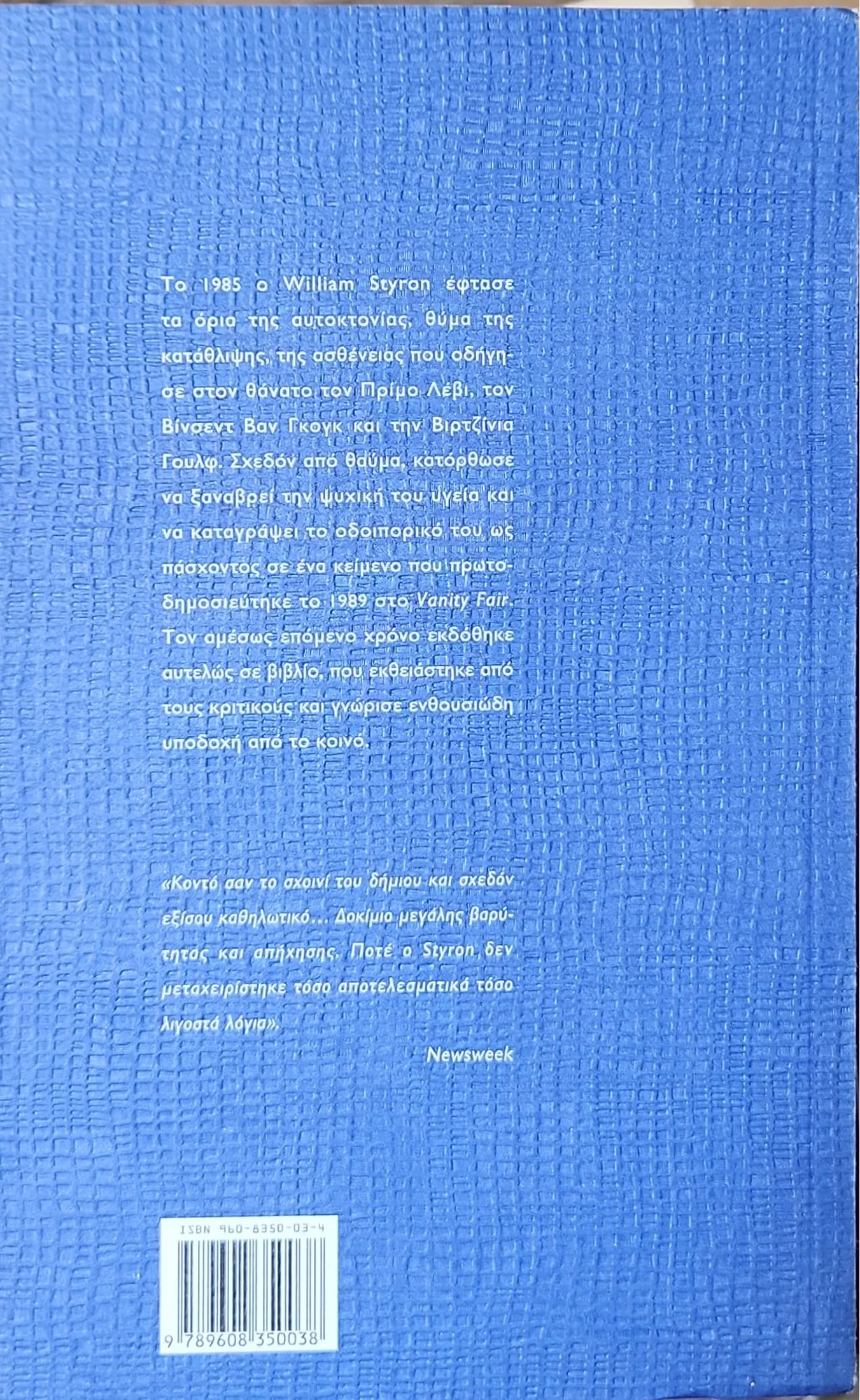 του Γουίλιαμ Στάιρον είναι ένα από τα πιο συγκλονιστικά χρονικά για την κατάθλιψη που έχουν γραφτεί ποτέ. Ο σπουδαίος αμερικανός συγγραφέας, γνωστός για έργα όπως η Επιλογή της Σόφι, καταγράφει με σπάνια ειλικρίνεια την προσωπική του κατάρρευση, όταν βρέθηκε αντιμέτωπος με την απειλή της αυτοκτονίας.
