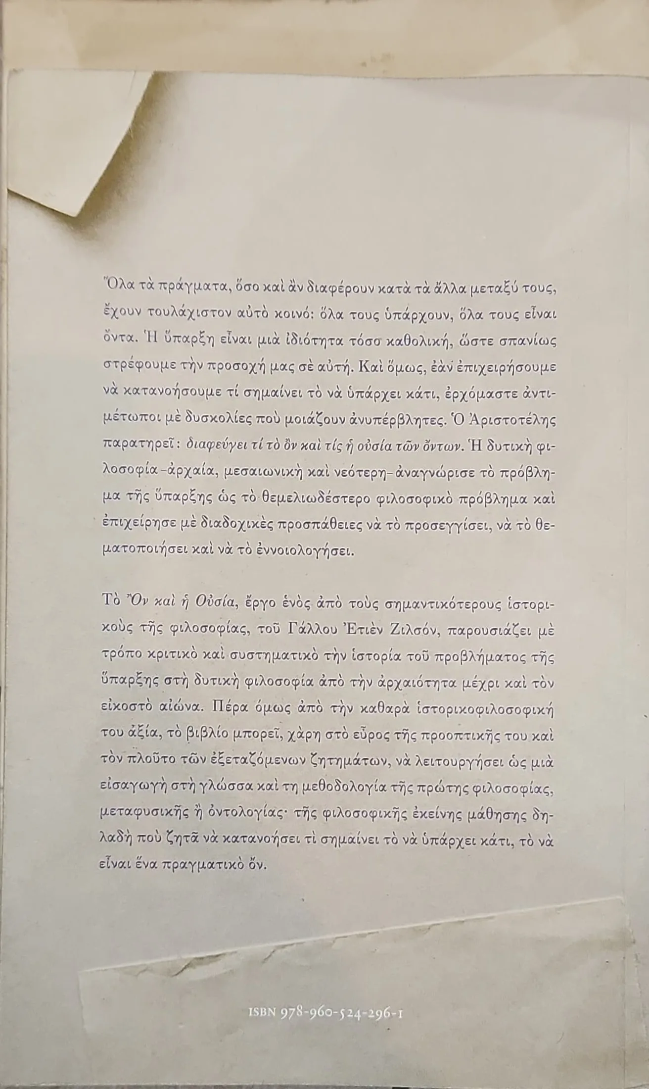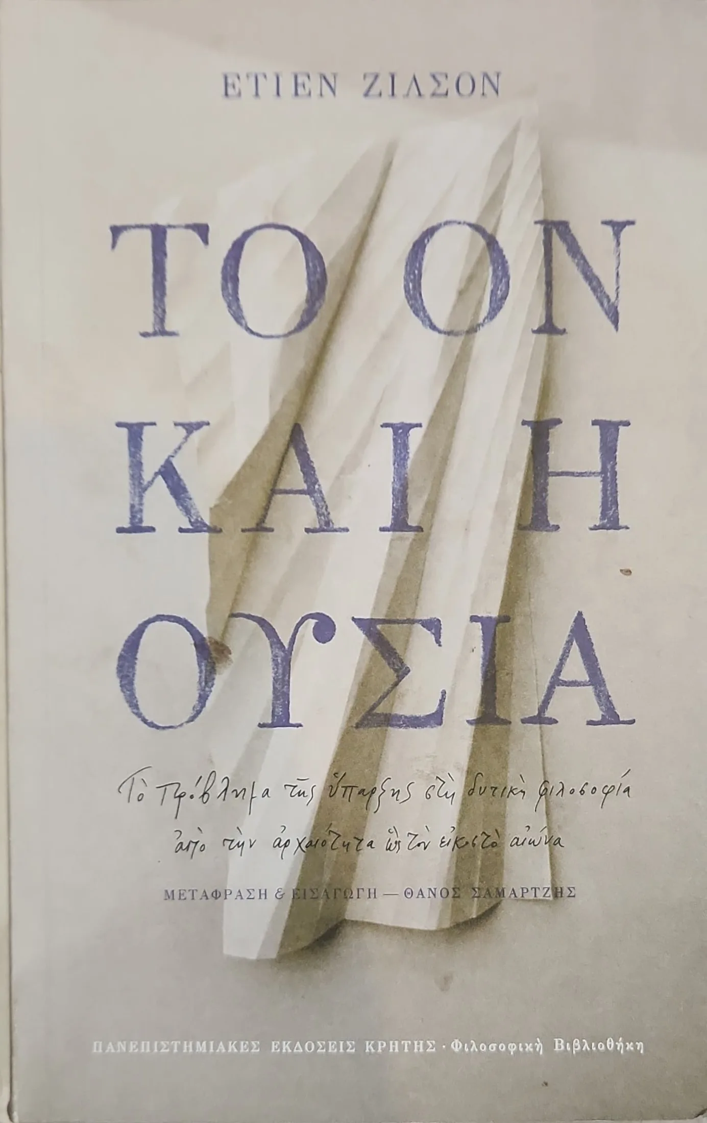 Το «ΤΟ ΟΝ ΚΑΙ Η ΟΥΣΙΑ» του Ετιέν Ζιλσόν αποτελεί μία κλασική και συστηματική ιστορική μελέτη του θεμελιώδους προβλήματος της Ύπαρξης (του «Είναι») στη δυτική φιλοσοφία, από την αρχαία ελληνική σκέψη (Αριστοτέλης) έως τον 20ό αιώνα. Ο Ζιλσόν, ως ένας από τους κορυφαίους ιστορικούς της φιλοσοφίας, αναλύει με κριτικό τρόπο τις διαδοχικές προσπάθειες να θεματοποιηθεί και να εννοιολογηθεί το «πραγματικό ον».