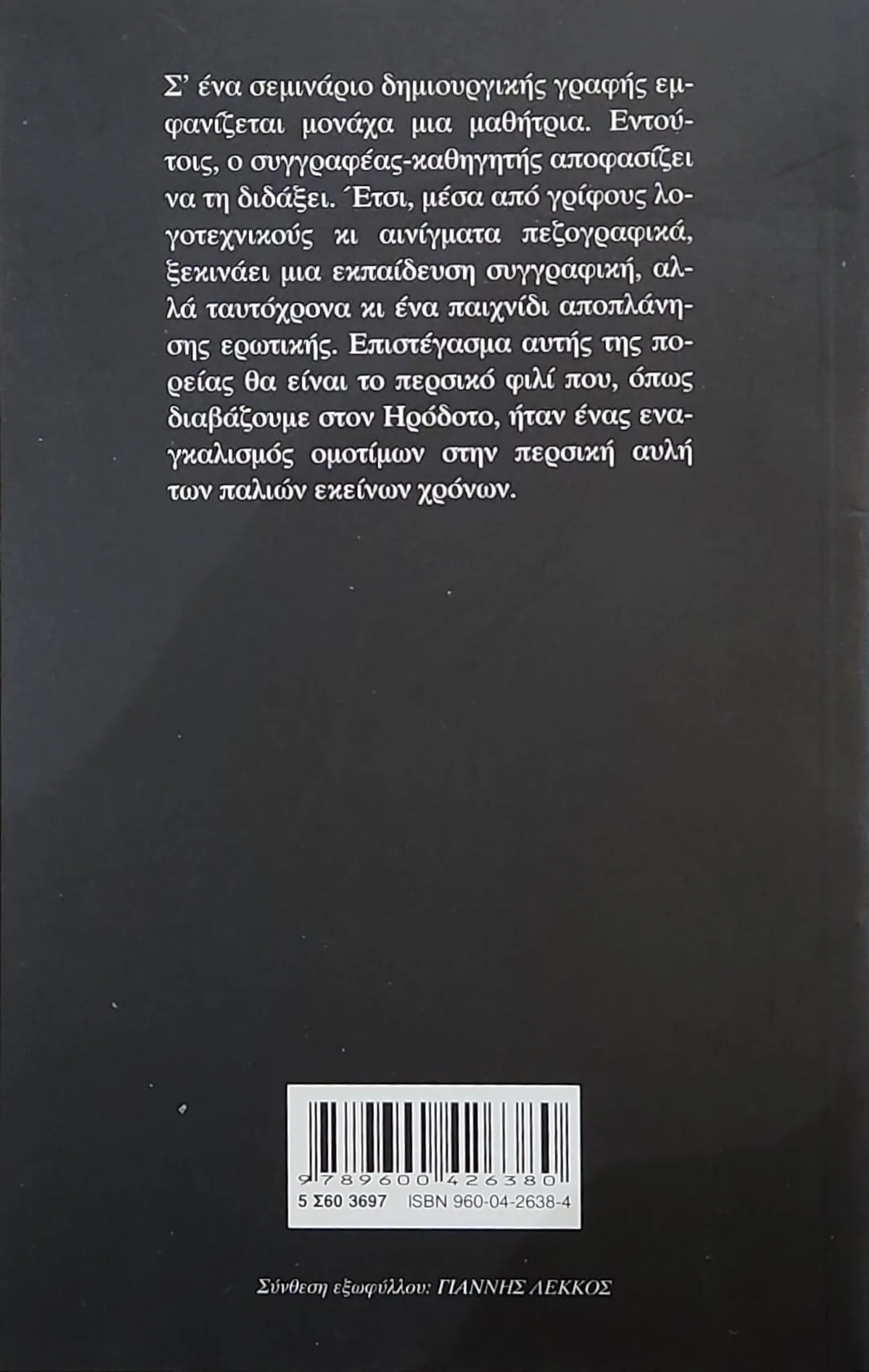 Σ’ ένα σεμινάριο δημιουργικής γραφής εμφανίζεται μονάχα μια μαθήτρια. Εντούτοις, ο συγγραφέας-καθηγητής αποφασίζει να τη διδάξει. Έτσι, μέσα από γρίφους λογοτεχνικούς και αινίγματα πεζογραφικά, ξεκινάει μια εκπαίδευση συγγραφική, αλλά ταυτόχρονα κι ένα παιχνίδι αποπλάνησης ερωτικής. Επιστέγασμα αυτής της πορείας θα είναι το περσικό φιλί που, όπως διαβάζουμε στον Ηρόδοτο, ήταν ένας εναγκαλισμός ομοτίμων στην περσική αυλή των παλιών εκείνων χρόνων. (ΑΠΟ ΤΗΝ ΠΑΡΟΥΣΙΑΣΗ ΣΤΟ ΟΠΙΣΘΟΦΥΛΛΟ ΤΟΥ ΒΙΒΛΙΟΥ)