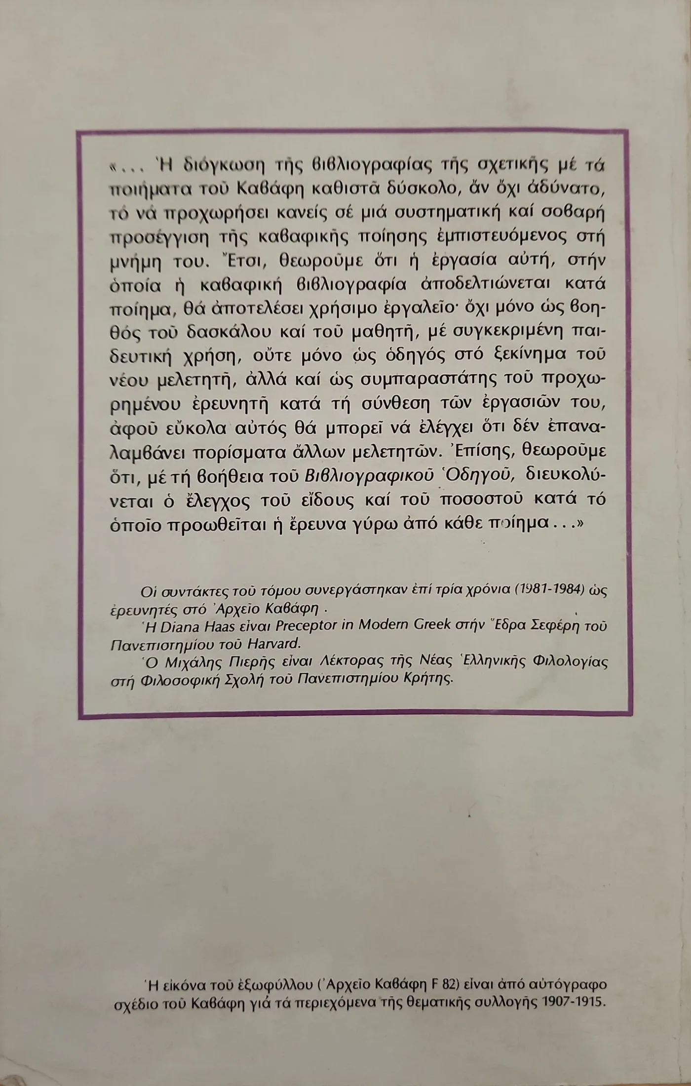 «… Η διόγκωση της βιβλιογραφίας της σχετικής με τα ποιήματα του Καβάφη καθιστά δύσκολο, αν όχι αδύνατο, το να προχωρήσει κανείς σε μια συστηματική και σοβαρή προσέγγιση της καβαφικής ποίησης εμπιστευόμενος στη μνήμη του. Έτσι, θεωρούμε ότι η εργασία αυτή, στην οποία η καβαφική βιβλιογραφία αποδελτιώνεται κατά ποίημα, θα αποτελέσει χρήσιμο εργαλείο- όχι μόνο ως βοηθός του δασκάλου και του μαθητή, με συγκεκριμένη παιδευτική χρήση, ούτε μόνο ως οδηγός στο ξεκίνημα του νέου μελετητή, αλλά και ως συμπαραστάτης του προχωρημένου ερευνητή κατά τη σύνθεση των εργασιών του, αφού εύκολα αυτός θα μπορεί να ελέγχει ότι δεν επαναλαμβάνει πορίσματα άλλων μελετητών. Επίσης, θεωρούμε ότι, με τη βοήθεια του “Βιβλιογραφικού Οδηγού”, διευκολύνεται ο έλεγχος του είδους και του ποσοστού κατά το οποίο προωθείται η έρευνα γύρω από κάθε ποίημα…». (Από την παρουσίαση στο οπισθόφυλλο του βιβλίου)
